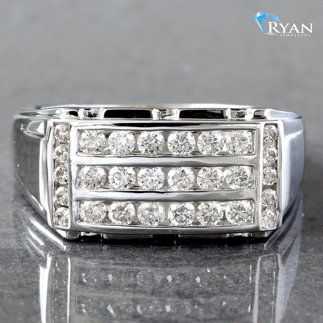 Mens rectangle earth mined diamond ring featuring round brilliant cut three row horizontal channel set center with vertical channel set diamond edges totalling 1.00ctw