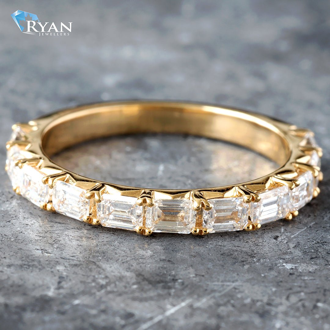 Lab Created Horizontal Emerald Cut Diamond Band High 14K Yellow Gold Polished V Prong Set Profile