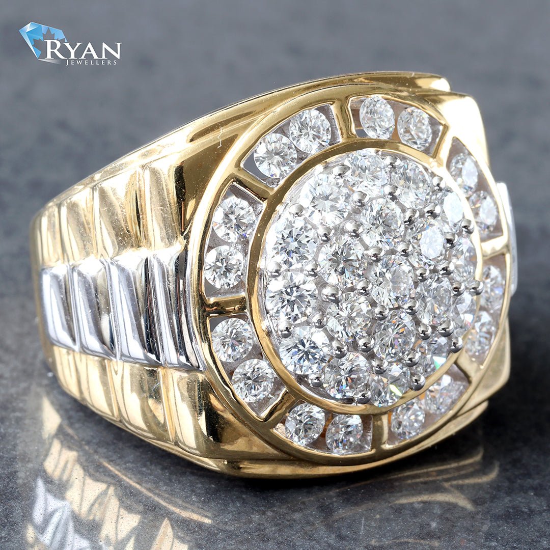 Men’s lab created diamond ring featuring 2 carats of round cut diamond in the center accented with a two tone jubilee watch strap inspired shoulders.