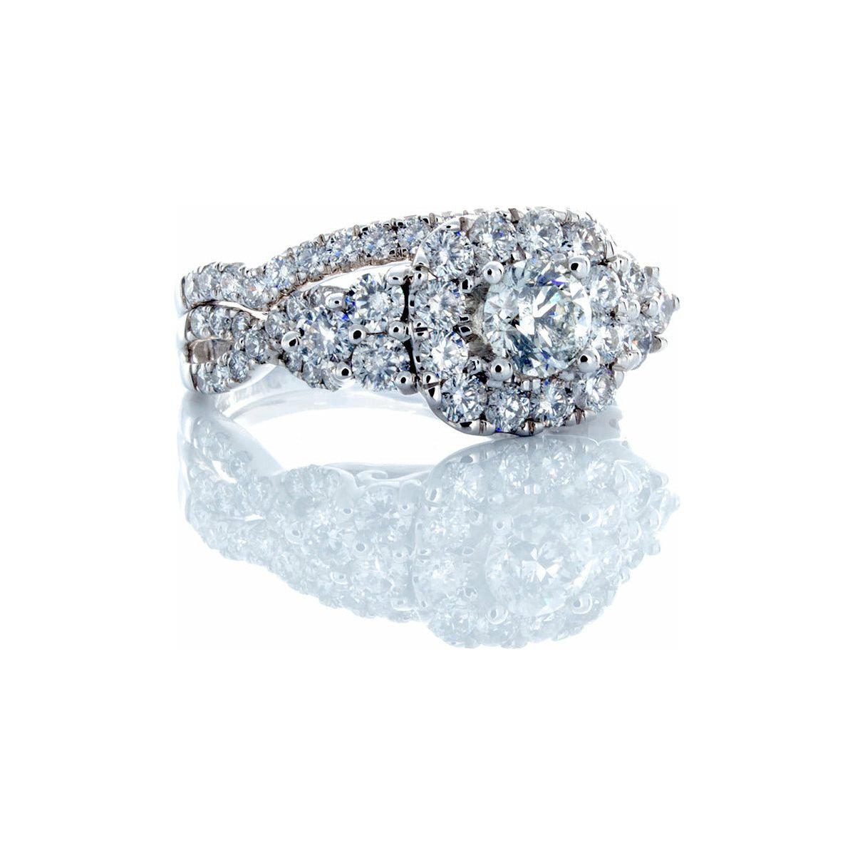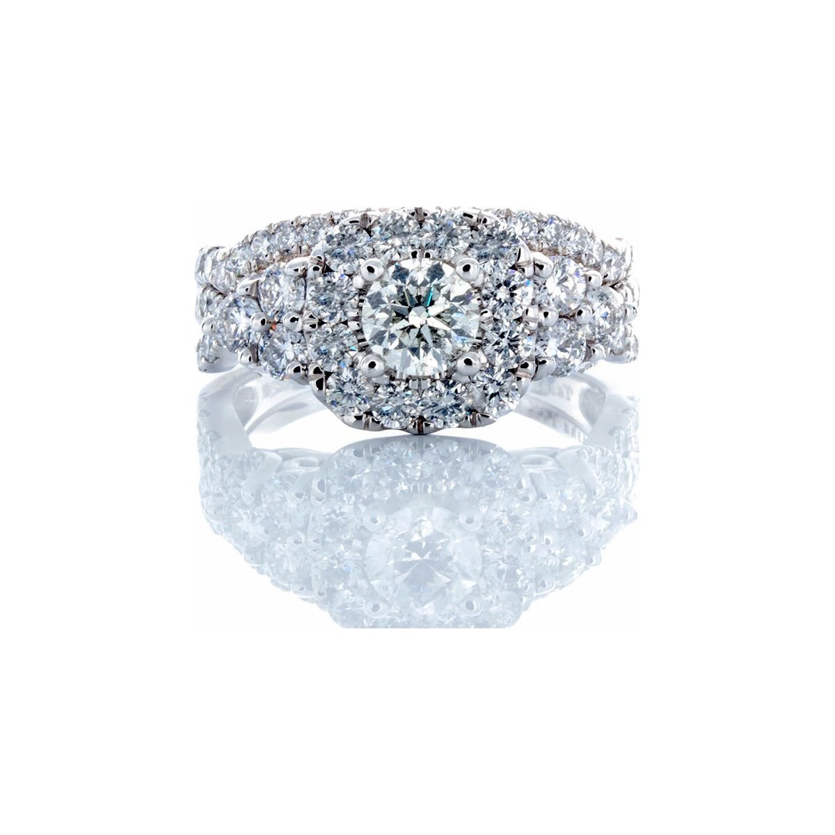 2.02CTW Cushion Halo Center Three Diamond Accents on Sides with Diamond Cross Over Shoulders & Matching Band 14k White Gold
