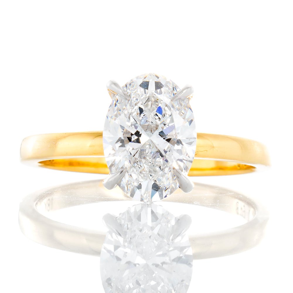 Lab Created Diamond Center totalling 2.01ct with a classic high polished yellow gold mount featuring one white gold head with 0.07ctw hidden diamond halo.