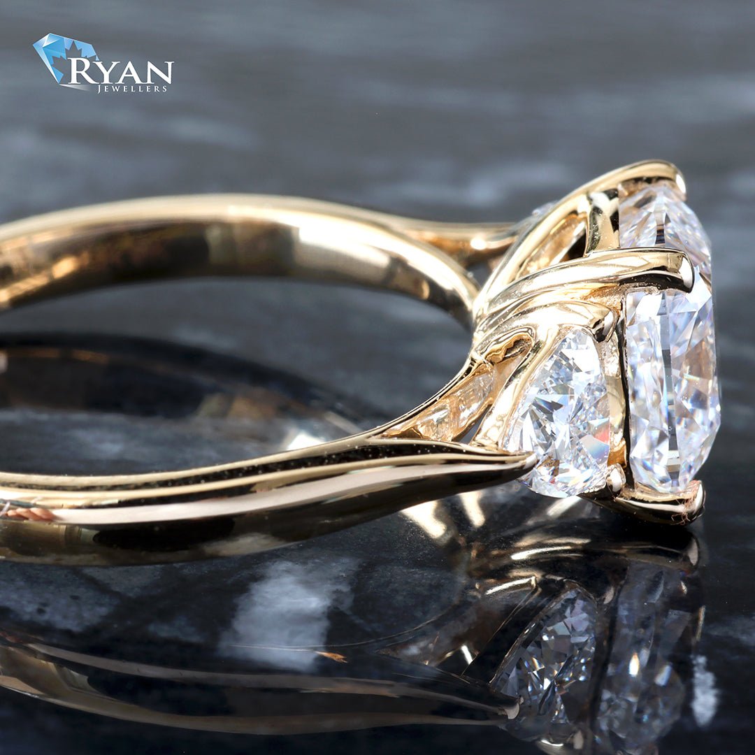 Lab Created Past Present Future Ring Featuring one Square cushion cut center accented with two trillion cut diamonds on the sides.