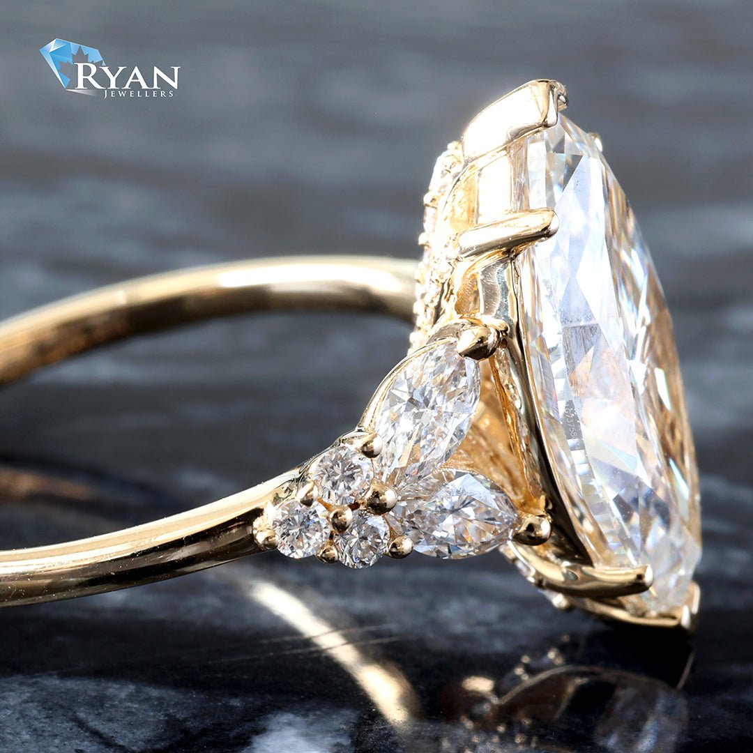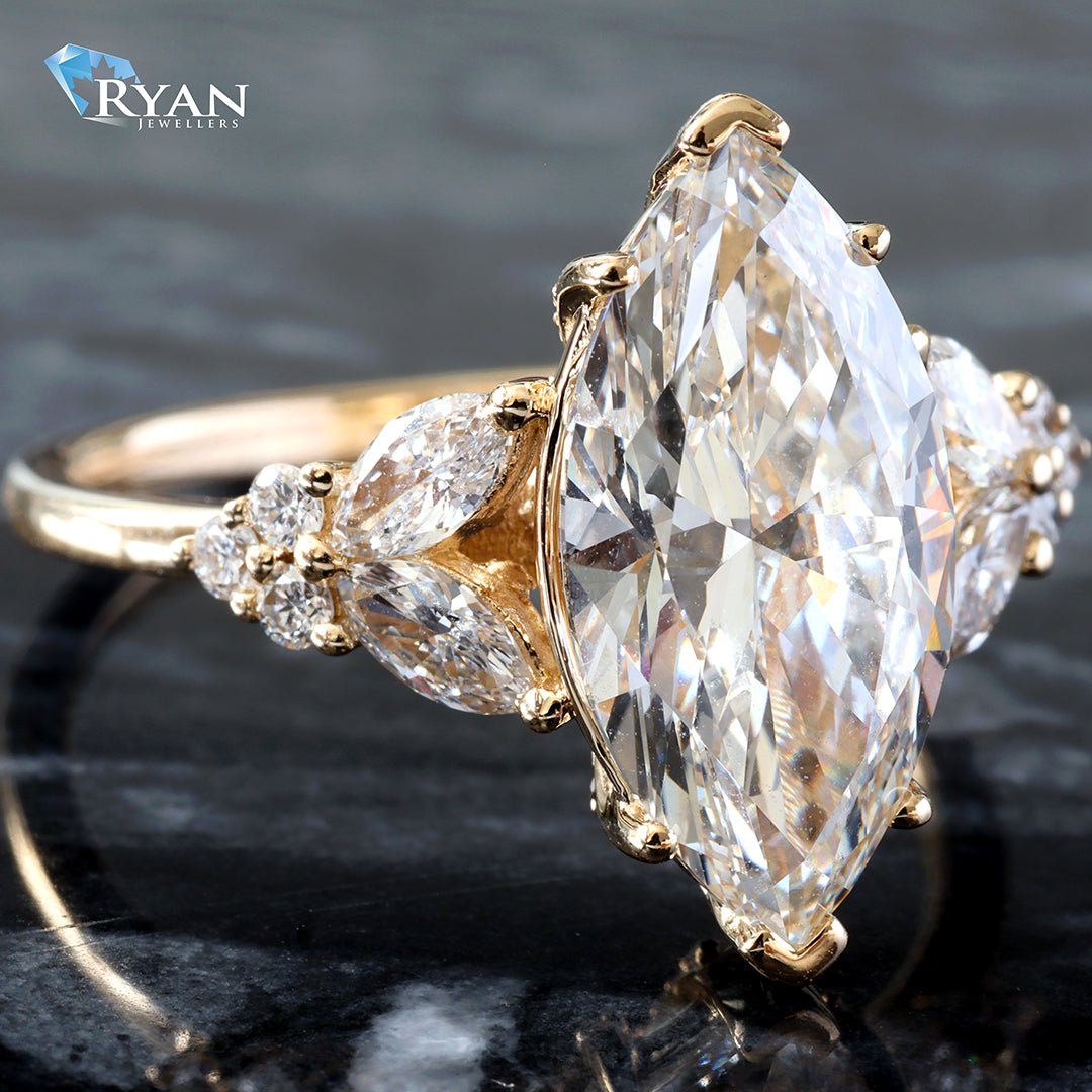 Beautiful lab created Marquise Solitaire with Marquise & Round Floral Shoulders Totalling 3.60 carats.
