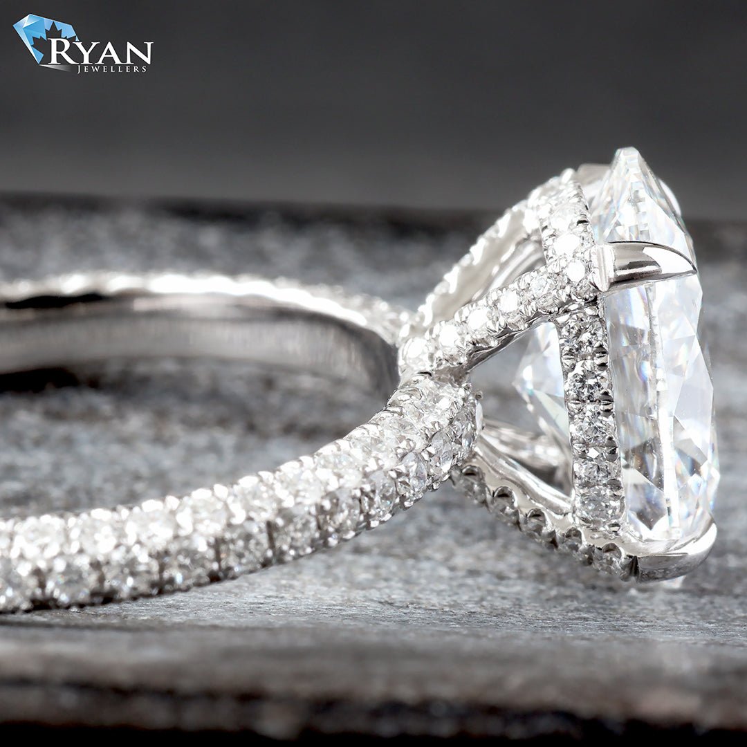 Lab Created Diamond ring featuring one 3ct oval cut diamond set into a 1.09ctw 14kt white gold three sided diamond mount with hidden diamond halo.