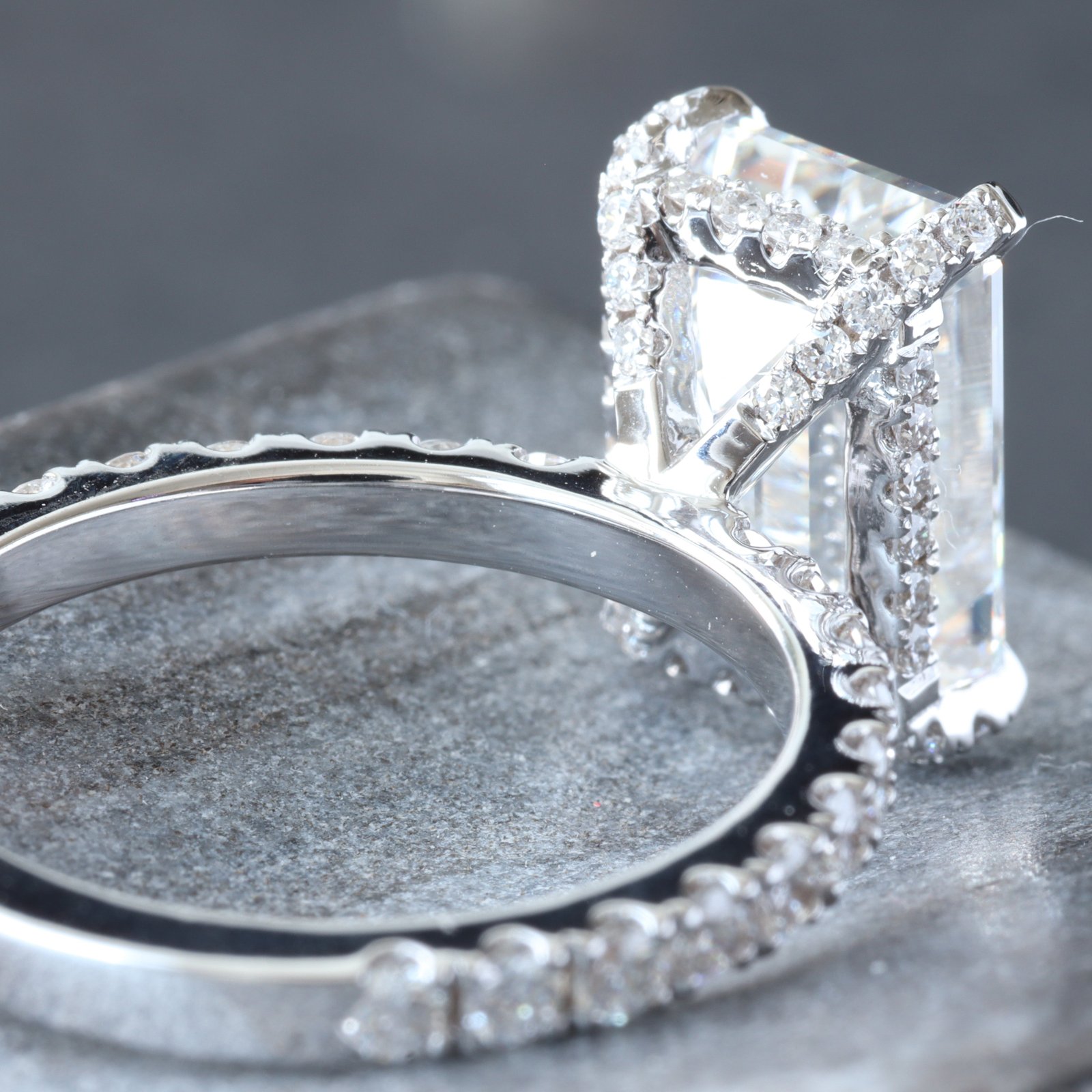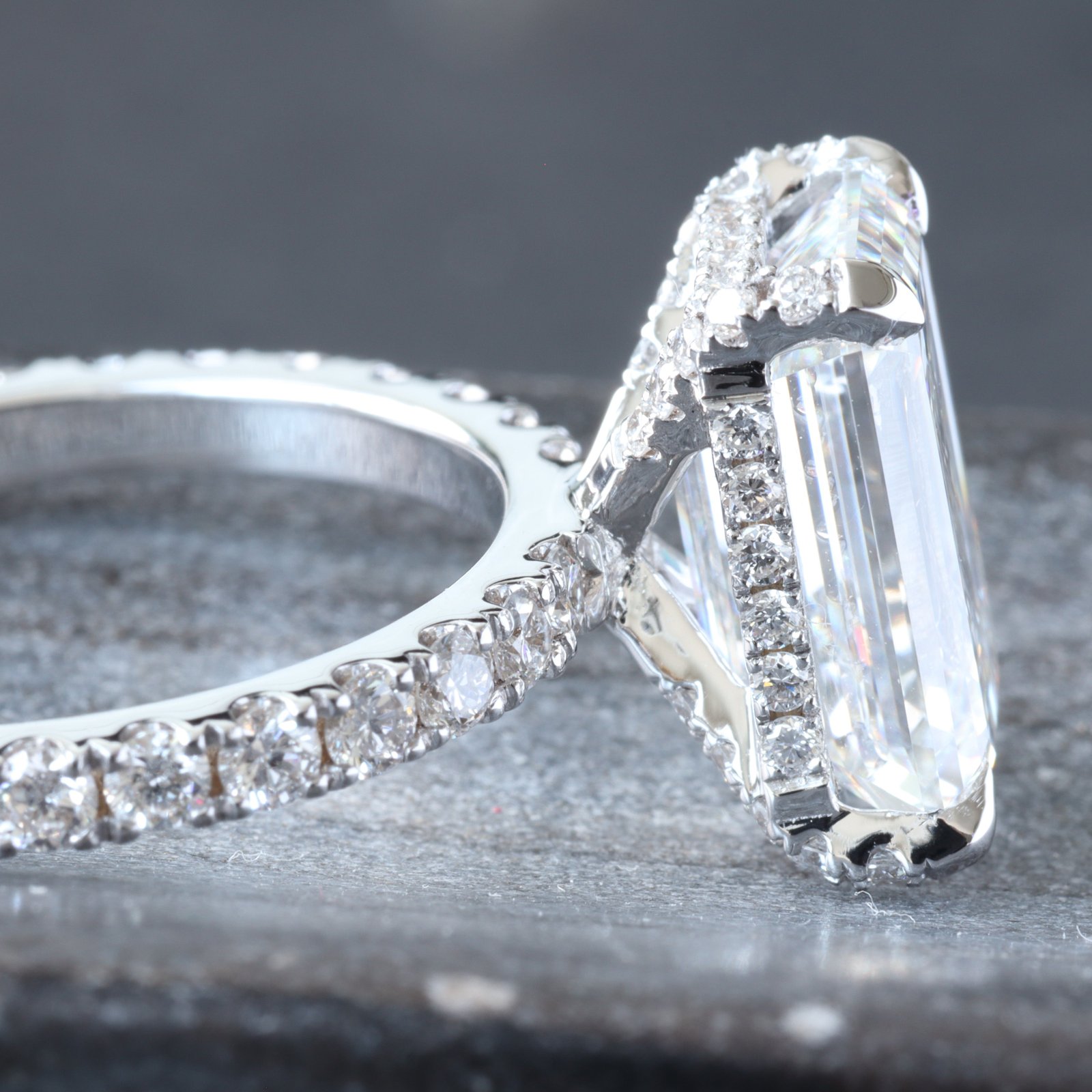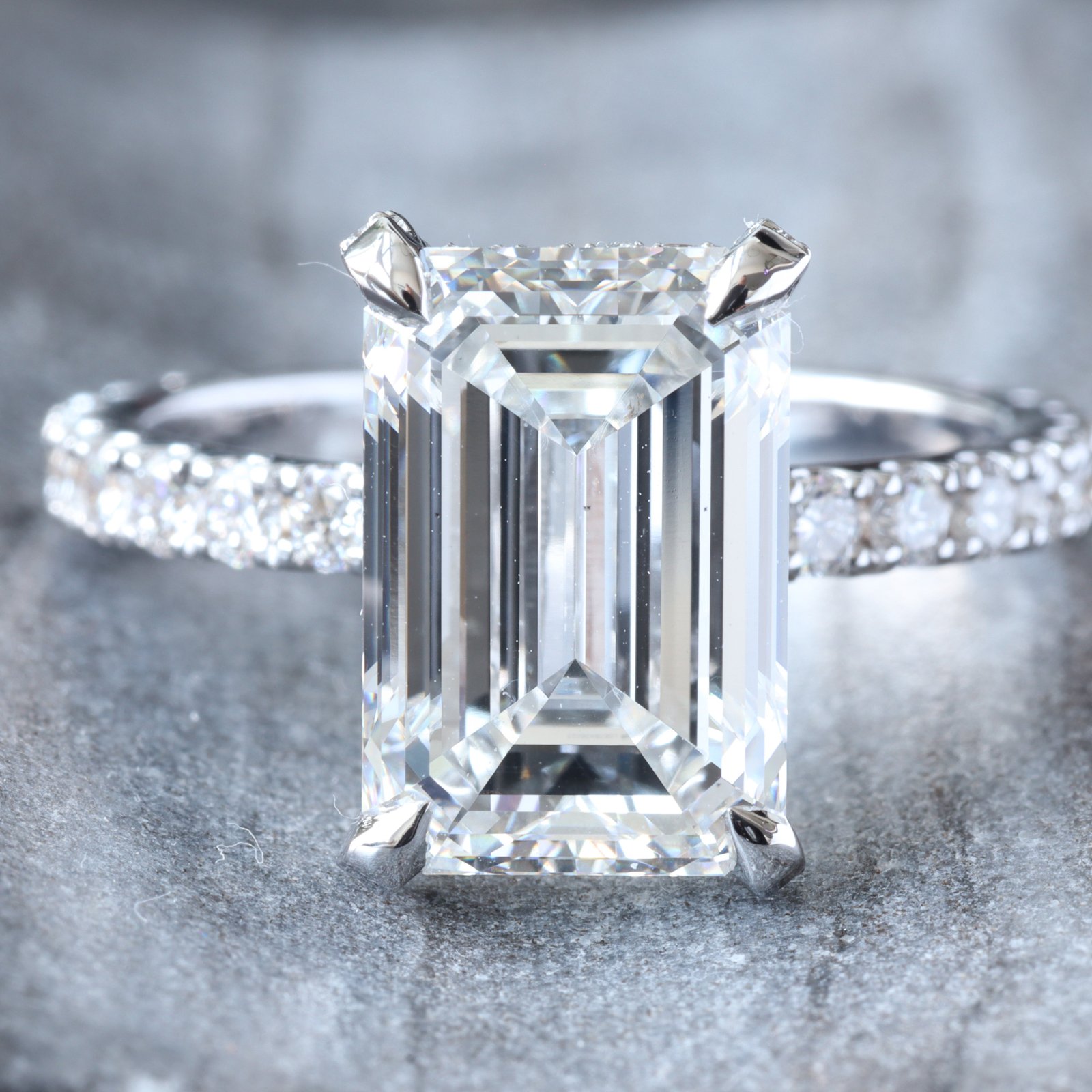 - Lab Created Emerald Cut Center Diamond Weight: 5.05 CT