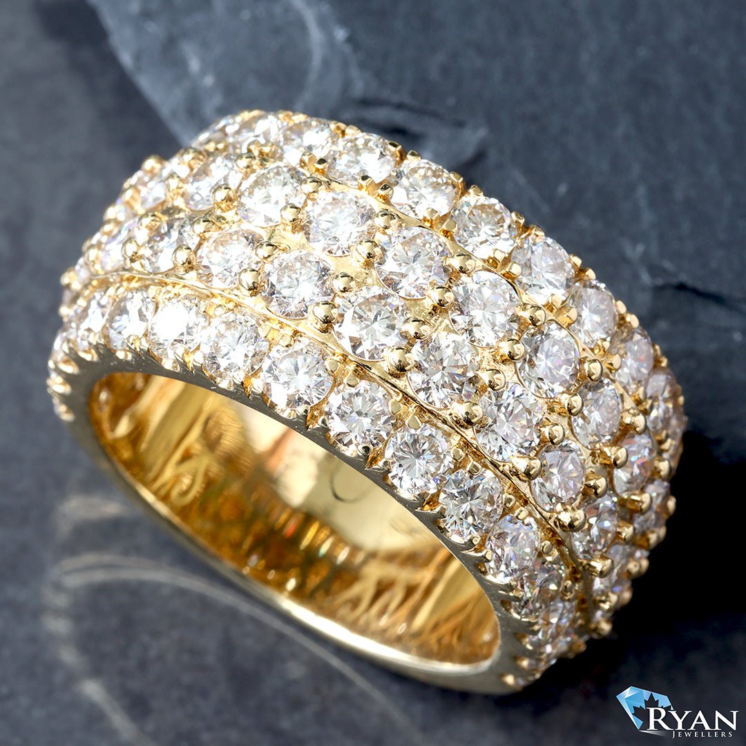 Big Earth Mined Diamond 13mm Band Featuring Four Rows Of Round Brilliant Cut prong Set Diamonds 3/4 Around The Shank Totalling 6.20 Carts Set in 14K Yellow Gold.