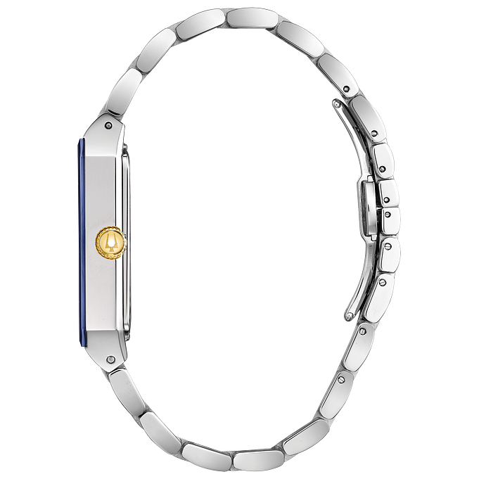 Introducing a new modern style. Silver-tone stainless steel case with edge-to-edge blue faceted metalizing mineral crystal and gold-tone crown. Blue dial with three diamonds set on dial. Water resistance to 30 metres.