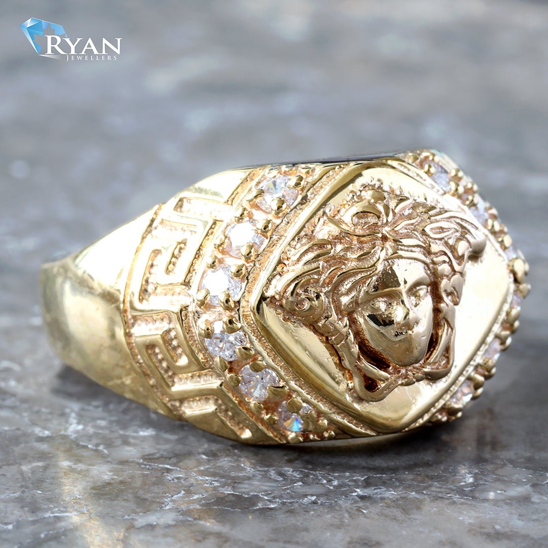 Medusa Head Cubic Zirconia Greek Key Sides Men’s Ring