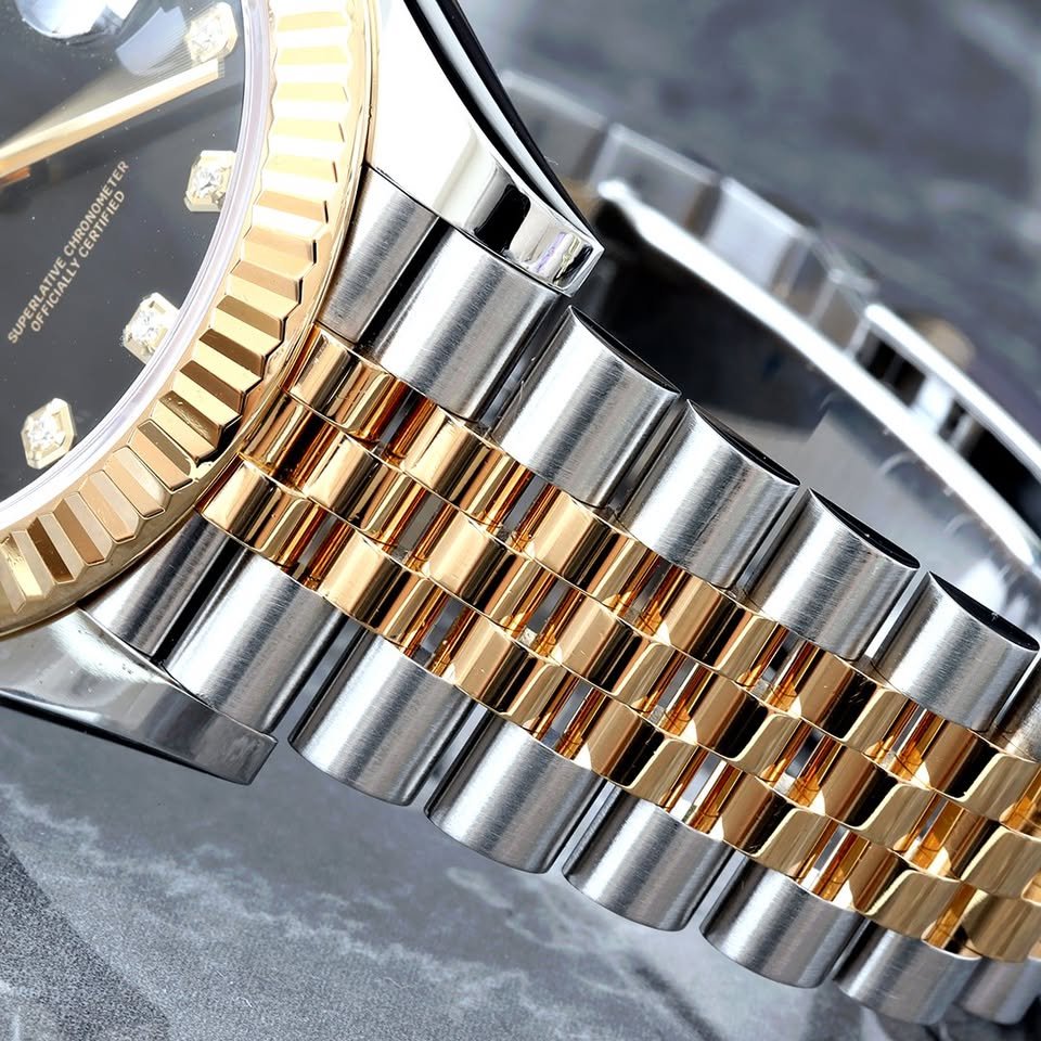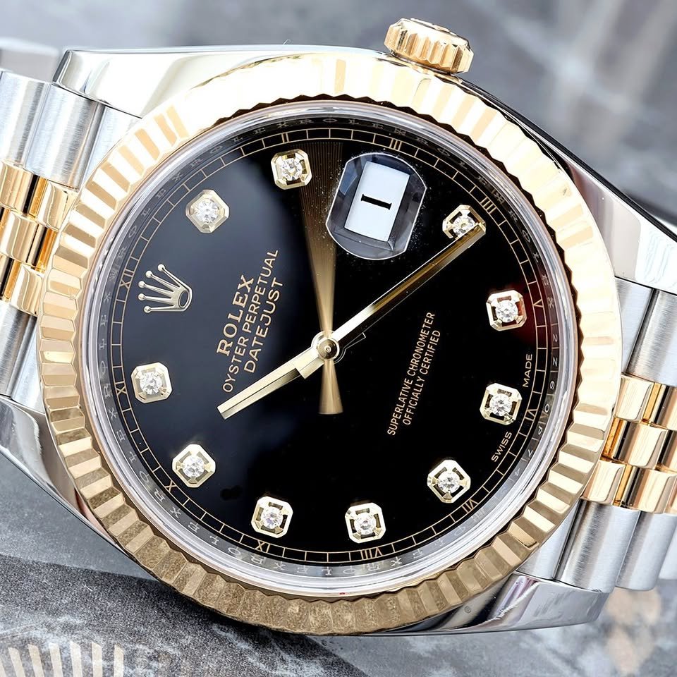 Rolex Datejust 41 Factory Black Diamond Dial 18K Yellow Gold Fluted Bezel Jubilee Watch