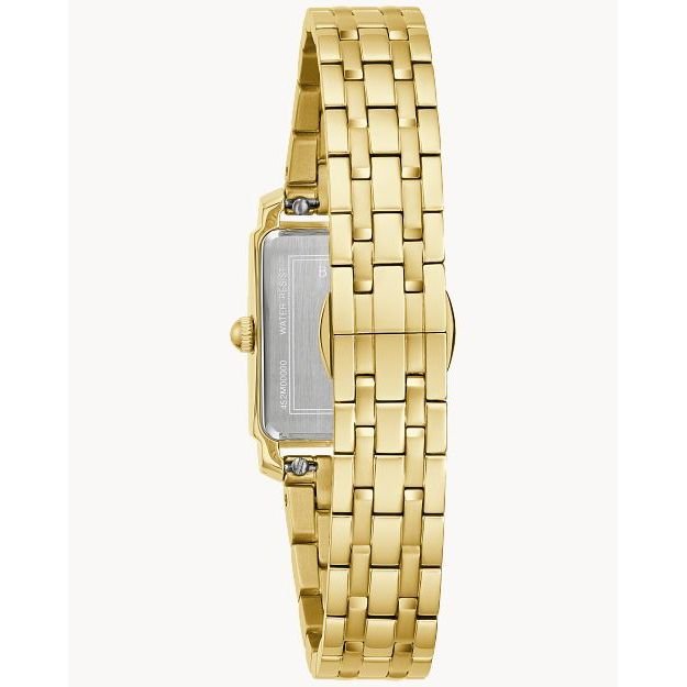 This all-new Bulova women’s timepiece brings a luxurious elegance to the already impressive Sutton Collection. The refined gold-tone stainless steel rectangular case features a mineral crystal and finishing that shines brilliantly in the light. The lustrous mother-of-pearl dial is accented with gold-tone Roman numeral markers and hands for a look of true elegance. A matching five-link gold-tone stainless steel bracelet features a deployant closure with pushers for a perfect fit and latched spring bars for easy release. This Bulova ladies’ timepiece offers an understated sense of luxury for the woman with an elevated sense of style.